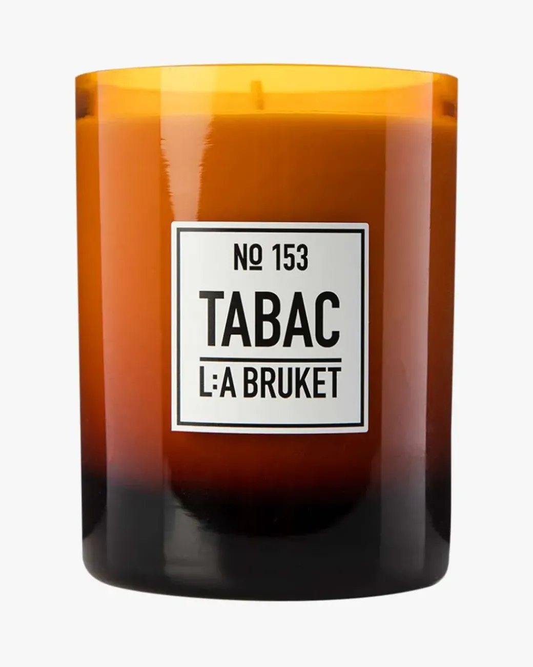 L:A Bruket 153 Scented Candle er et duftlys laget av voks fra økologisk soya med en duft av tabac. Lyset fylles for hånd i et munnblåst tonet ravfarget glass. Lyset har en brenntid på mer enn 45 timer.