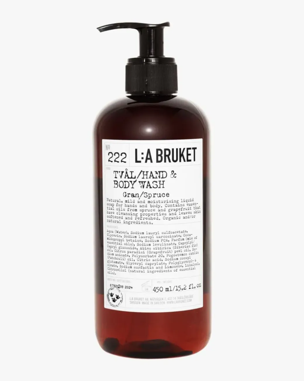 L:A Bruket 222 Hand & Body Wash Spruce er en naturlig, mild og svært fuktighetsgivende flytende såpe som skånsomt renser og mykgjør kropp og hender.