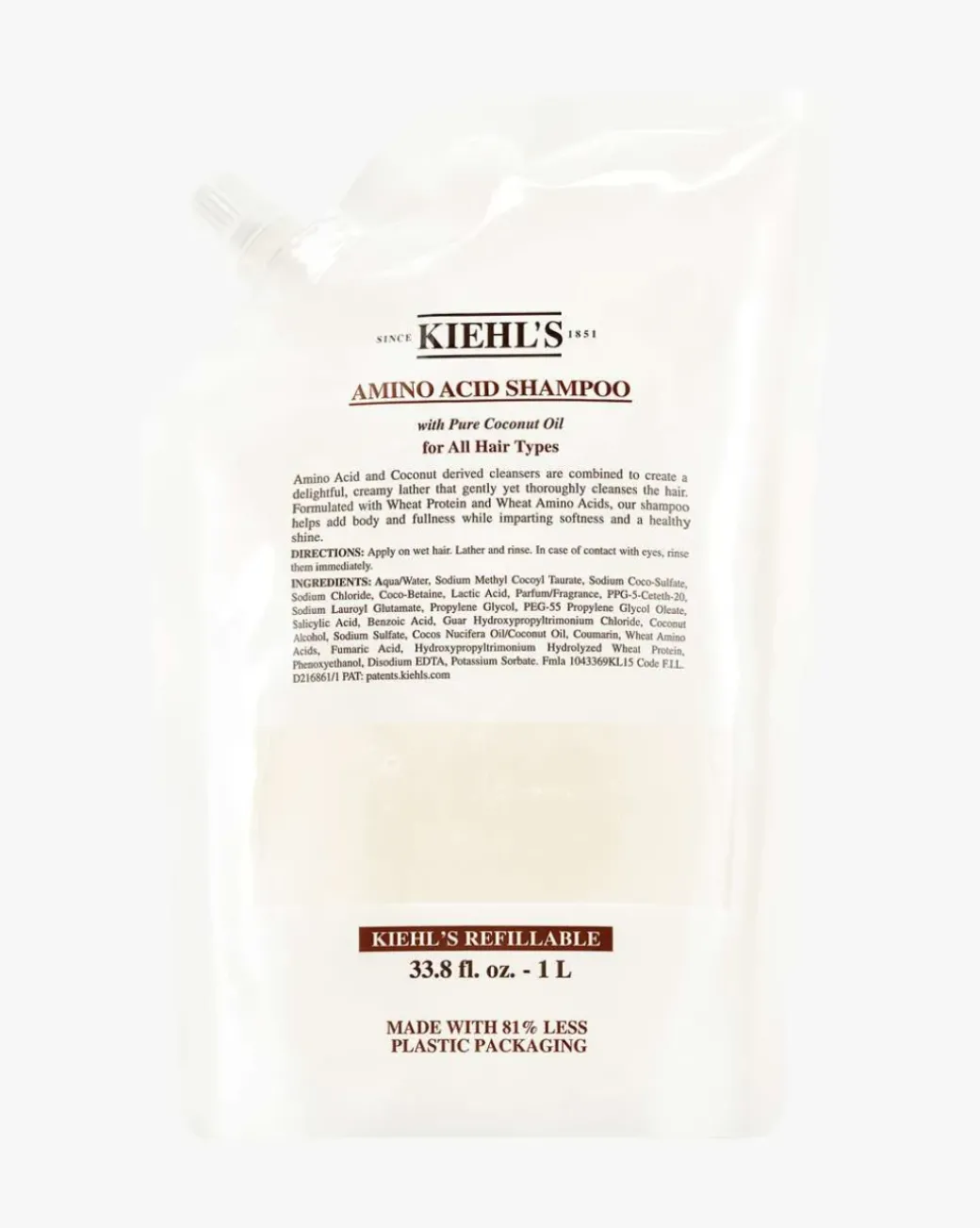 Kiehl's Amino Acid Shampoo Refill er en skånsom og mild sjampo, utviklet for alle hårtyper. Denne sjampoen er tilsatt ren kokosolje og skaper et herlig, kremet skum som skånsomt rengjør håret. Med hveteproteiner og aminosyrer bidrar denne sjampoen også til å gi håret fylde og en sunn glans. Amino Acid Shampoo er velegnet til alle typer hår og hodebunner hvis man ønsker et mildt produkt. Nå i en refill-pose som inneholder 80% mindre plast.