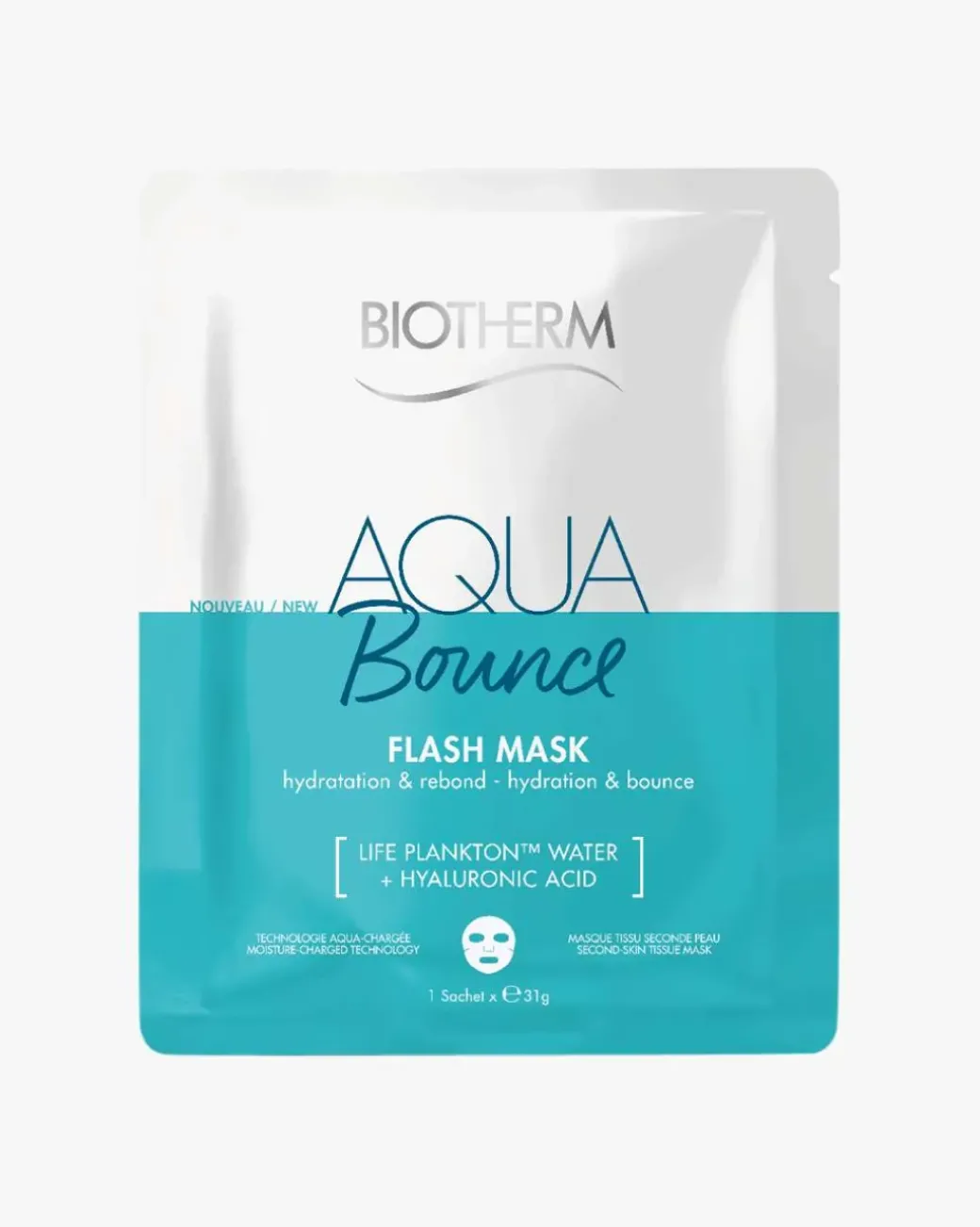 Biotherm Aqua Super Mask Bounce er en sheet maske som inneholder fuktighetsgivende hyaluronsyre og Life Plankton Water, som tilfører huden fukt. Ansiktsmasken er utviklet til å holde på mer serum enn andre klassiske sheet masker. Hyaluronsyre har en plumpende effekt som gir økt spenst og fasthet til huden. Umiddelbar effekt, men langvarig resultat forekommer ved jevnlig bruk.