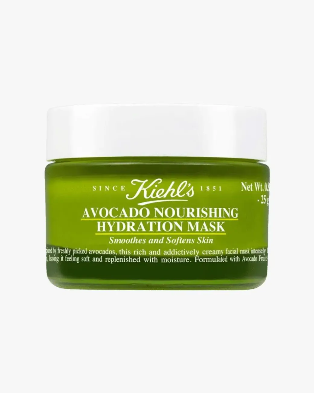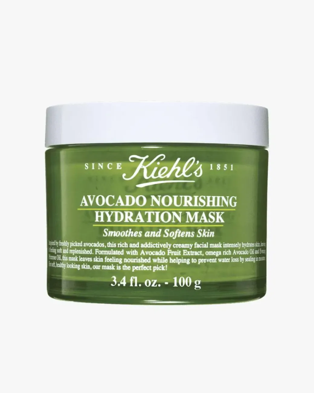 Kiehl’s Avocado Nourishing Hydration Mask er en fyldig og kremete ansiktsmaske som er inspirert av nyplukkede avokadoer. Den fukter huden samt får den til å føles myk og mettet med fukt. Masken inneholder ekstrakt av avokado, omega-rik avokadoolje og nattlysolje og får huden til å føles næret samt hjelper med å forebygge vanntap ved å innkapsle fuktigheten. Den fyldige og kremete konsistensen minner om en friskmost avokado. Det anbefales å bruke masken tre ganger i uken.