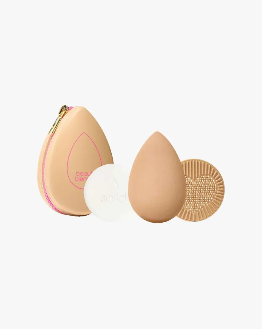 Settet inneholder: 1 beautyblender® sminkesvamp: Nude, 1 blendercleanser® SOLID Limited-Edition svamp- og børsterens, 16g, 1 skrubbematte i silikon og 1 reiseetui.