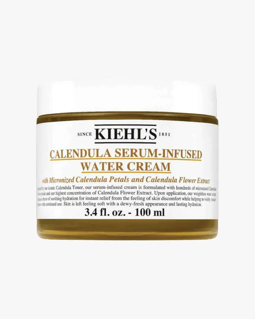 Kiehl’s Calendula Serum-Infused Water Cream er en lett og forfriskende serum-infusert «vann i krem» som tilfører huden fukt så den føles glatt og myk. Over tid blir huden synlig forbedret, jevnere, smidigere og mer strålende. Kremen har en unik konsistens som inneholder hundrevis av mikroniserede blomsterblader fra ringblomst, også kalt Calendula.