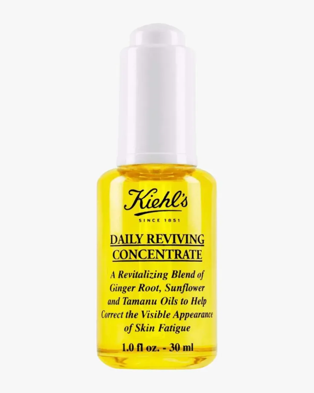 Kiehl’s Daily Reviving Concentrate er en ansiktsolje som gjenoppliver huden og reduserer de tretthetstegnene som oppstår i løpet av dagen. Den styrker og beskytter hudens barriere og gir huden et sunt, glatt og friskt utseende hele dagen. Formelen inneholder en blanding av essensielle og botaniske oljer av 100% naturlig opprinnelse. Nøkkelingrediensene er oljer fra ingefærrot som er rik på antioksidanter, samt tamanu og solsikkefrø.