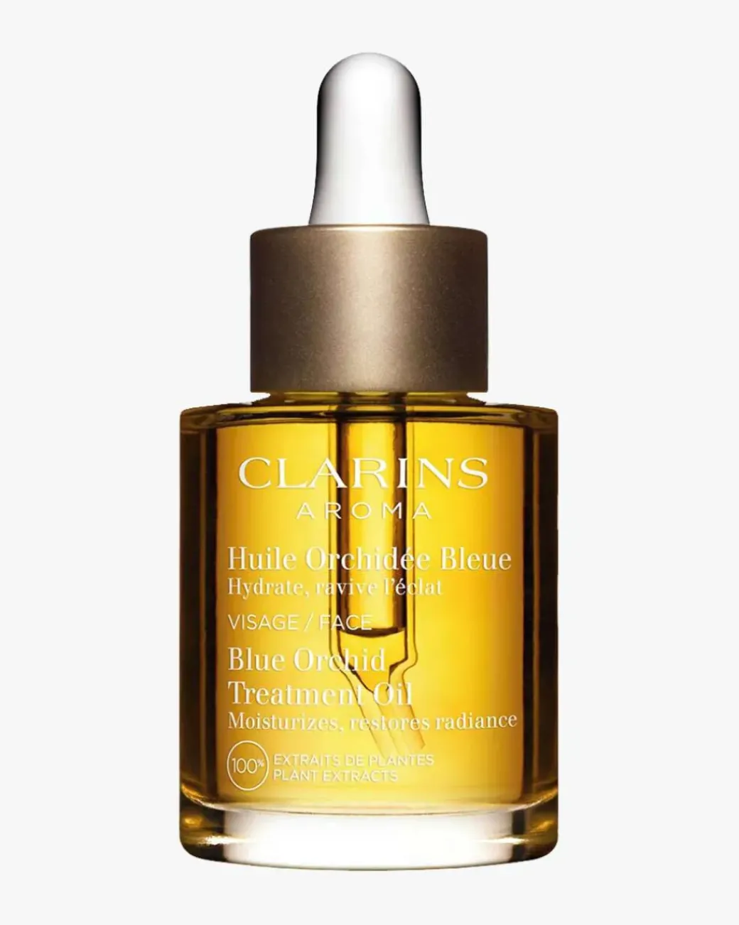 Clarins Face Treatment Oil Blue Orchid Dehydrated Skin er en ansiktsolje med 100% rene planteekstrakter – for en normal til dehydrert hud som lett kan føles tørr. Olje anbefales fordi det er det produtket som trekker dypest ned i huden og gir næring og fukt i alle hudlag. Ansiktsoljen absorberes umiddelbart, og etterlater huden med en følelse av velvære og vakker glød. I over 60 år har Clarins tatt i bruk utallige vitenskapelige metoder for å avsløre plantenes pleiende egenskaper. De 100% rene oljene av planteekstrakter, ble laget i 1965 for bruk i skjønnhetsinstitutter for å hjelpe huden med å komme i balanse. Oljene er en kombinasjon av planteekstrakter og essensielle oljer, selve grunnlaget for aromaterapi og phytoterapi.