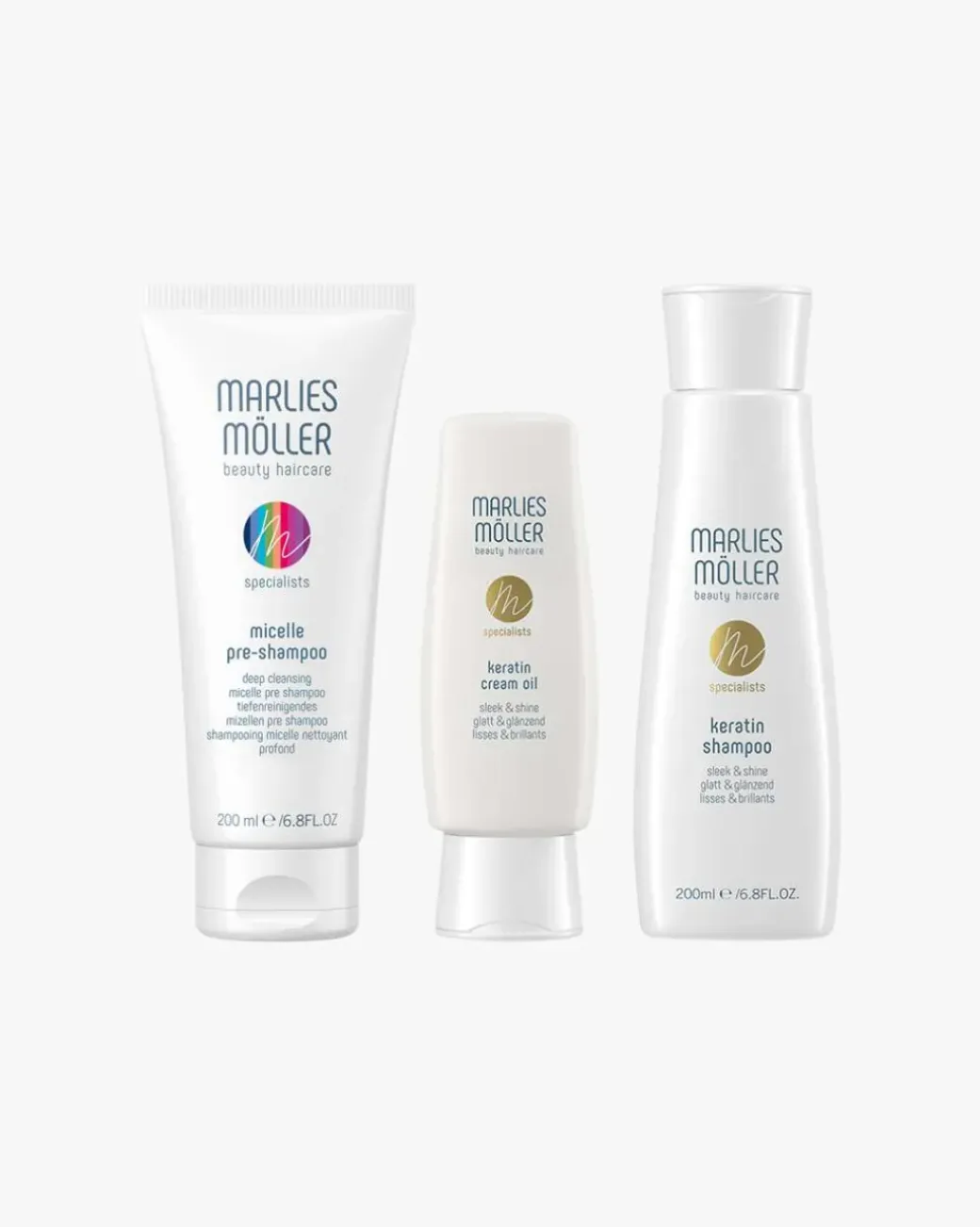Settet inneholder: Micelle Pre-Shampoo 200ml, Keratin Shampoo 200ml og Keratin Cream Oil 100ml.