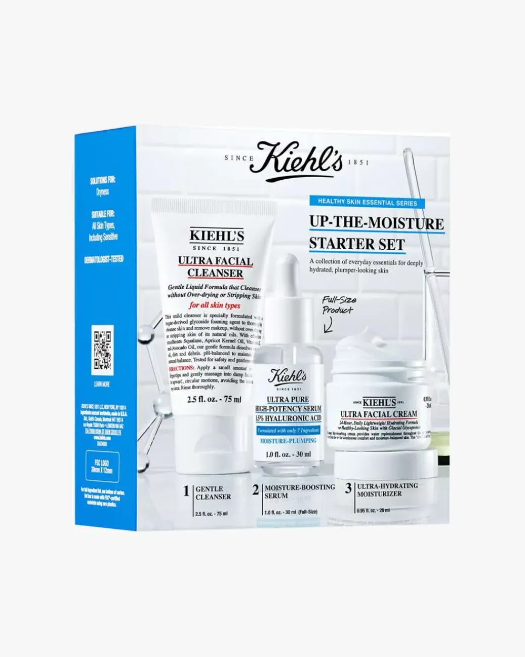 Kiehl’s Moisture Barrier Booster er et sett med fuktighetsgivende Kiehl’s hudpleieprodukter som bidrar til å holde hudens barriere sunn med en skånsom ansiktsrens, serum med konsentrert 1,5% hyaluronsyre og næringsgivende fuktighetskrem, som tilfører huden fukt i 24 timer.