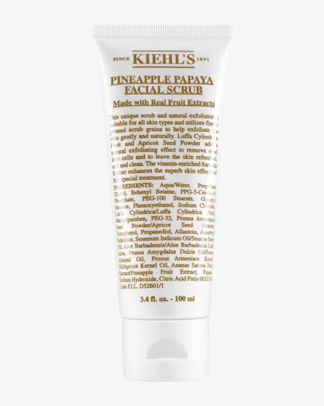 Kiehl’s Pineapple Papaya Facial Scrub passer til alle hudtyper. Den inneholder små kjerner fra ananas og papaya som eksfolierer huden skånsomt og naturlig. Døde hudceller blir fjernet og huden føles frisk, myk og ren etter bruk. Anvendes ved behov.