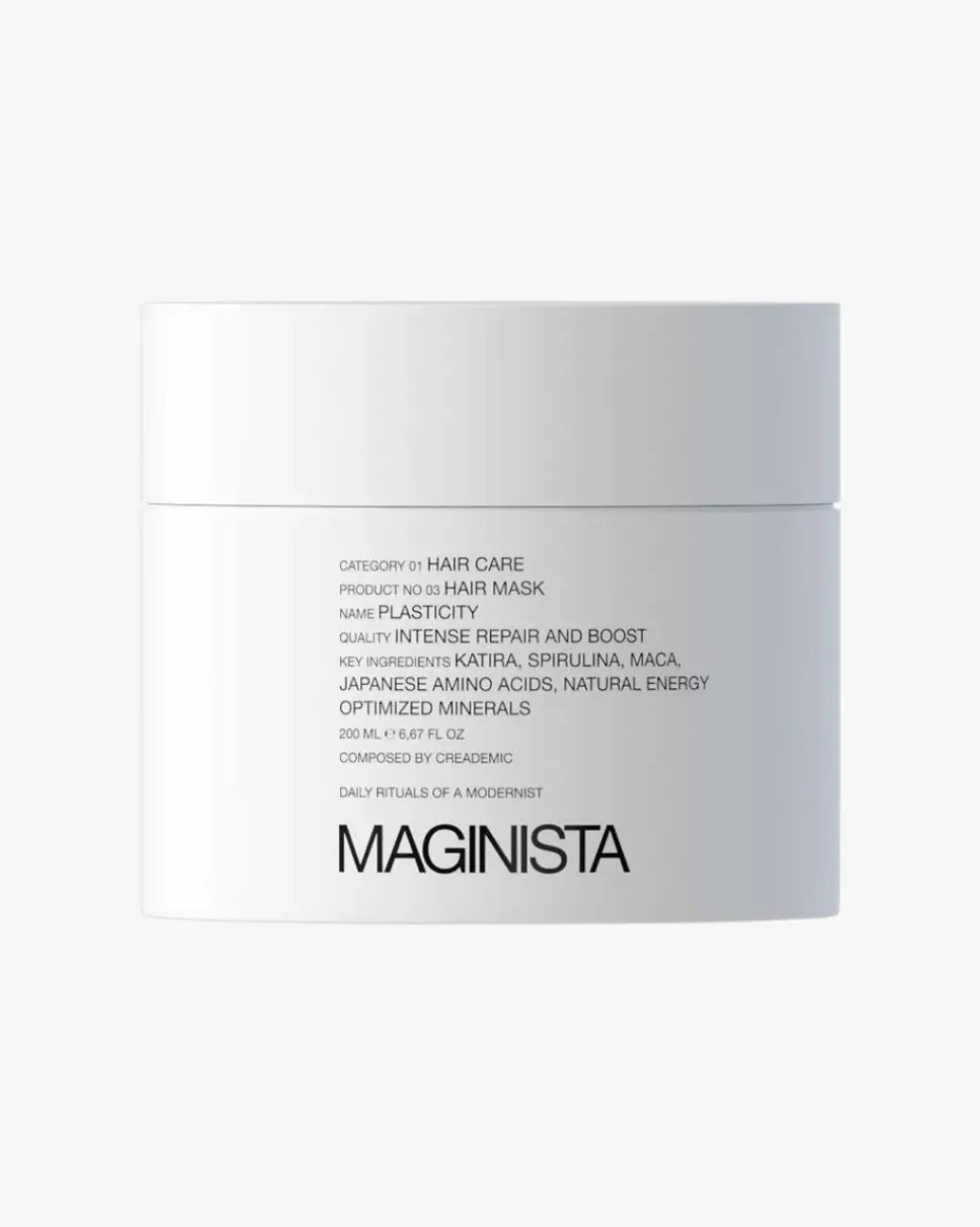 Maginista Plasticity Hair Mask er en intens og virkningsfull blanding av naturlige, energioptimerte mineraler og planteekstrakter, blant annet katira fra Midtøsten, maca fra Peru og spirulina fra Hawaii.
