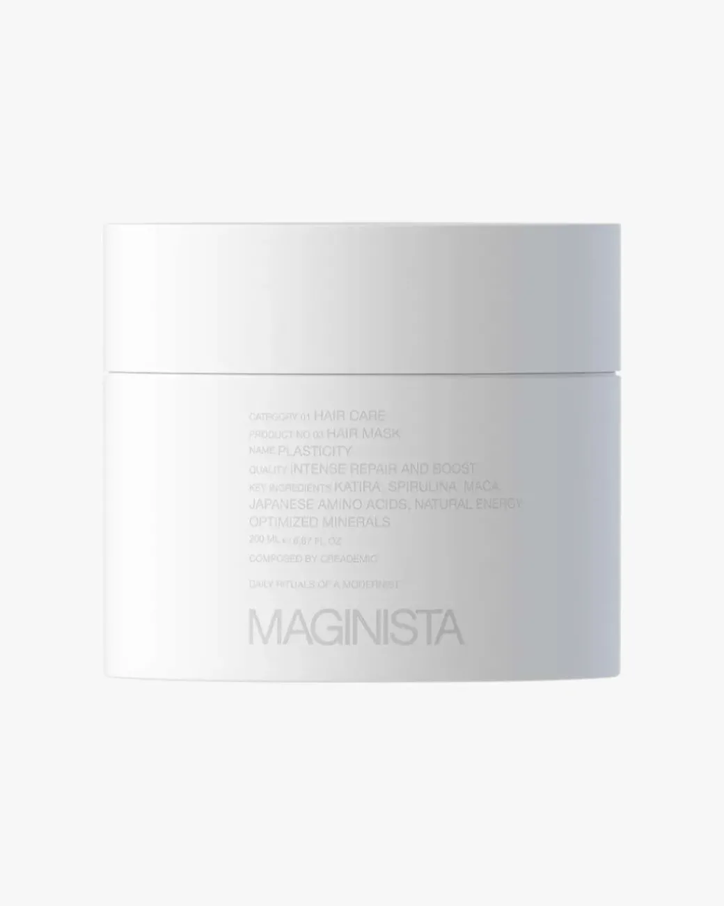 Maginista Plasticity Hair Mask Perfume Free er en intens og virkningsfull blanding av naturlige, energioptimerte mineraler og planteekstrakter, blant annet katira fra Midtøsten, maca fra Peru og spirulina fra Hawaii.