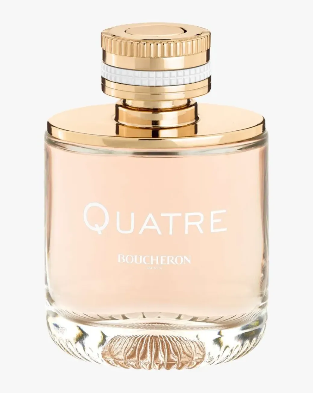 Boucheron Quatre Femme Eau de Parfum åpner friskt med grønn mandarin og bitter appelsin, samtidig som røde bær og villjordbær overrasker oss med deres deilige fruktige noter. Hjertenotene er fylt med sensualitet fra rose og jasmin. Gyldne trenoter og sedertre gir duften en struktur, mens mykheten av cashmere avslører en dyp sensuell duftsti når den blandes med musk. Toppnoter: Bitter appelsin. Hjertenoter: Jasmin. Bunnoter: Sedertre.