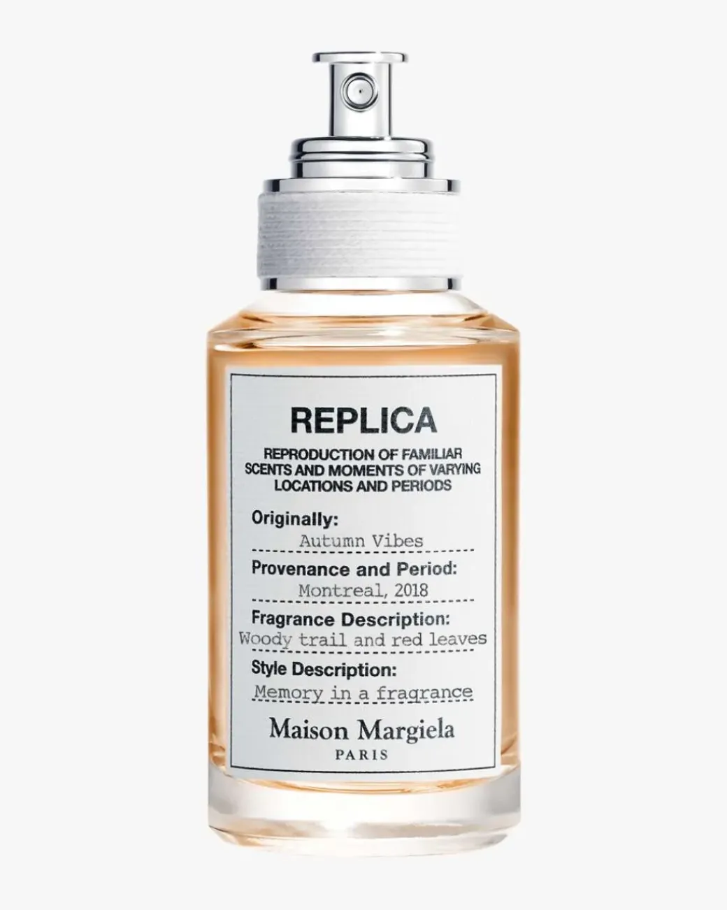 Fra minner til dufter: Replica-kolleksjonen samler ikoniske dufter og duftlys som har den universelle kraften til å trigge personlige øyeblikk, personlige historier som lever eller skal leves. Maison Margiela er tro mot sin «creative collective»-tilnærming, og samarbeider med de beste parfymørene. De er utvalgt for sin evne til å knytte minner til dufter, og stimulert av den kunstneriske fremførelsen av å komponere en duft som en universell invitasjon til å våkne, feire og dele uforglemmelige følelser. I tråd med Maisons’ minimalistiske tilnærming er Replica-flasken enkel, men sofistikert. Hver duft identifiseres av en bomullsetikett som ligner etikettene som brukes på klær og tilbehør i Replica-kolleksjonen.