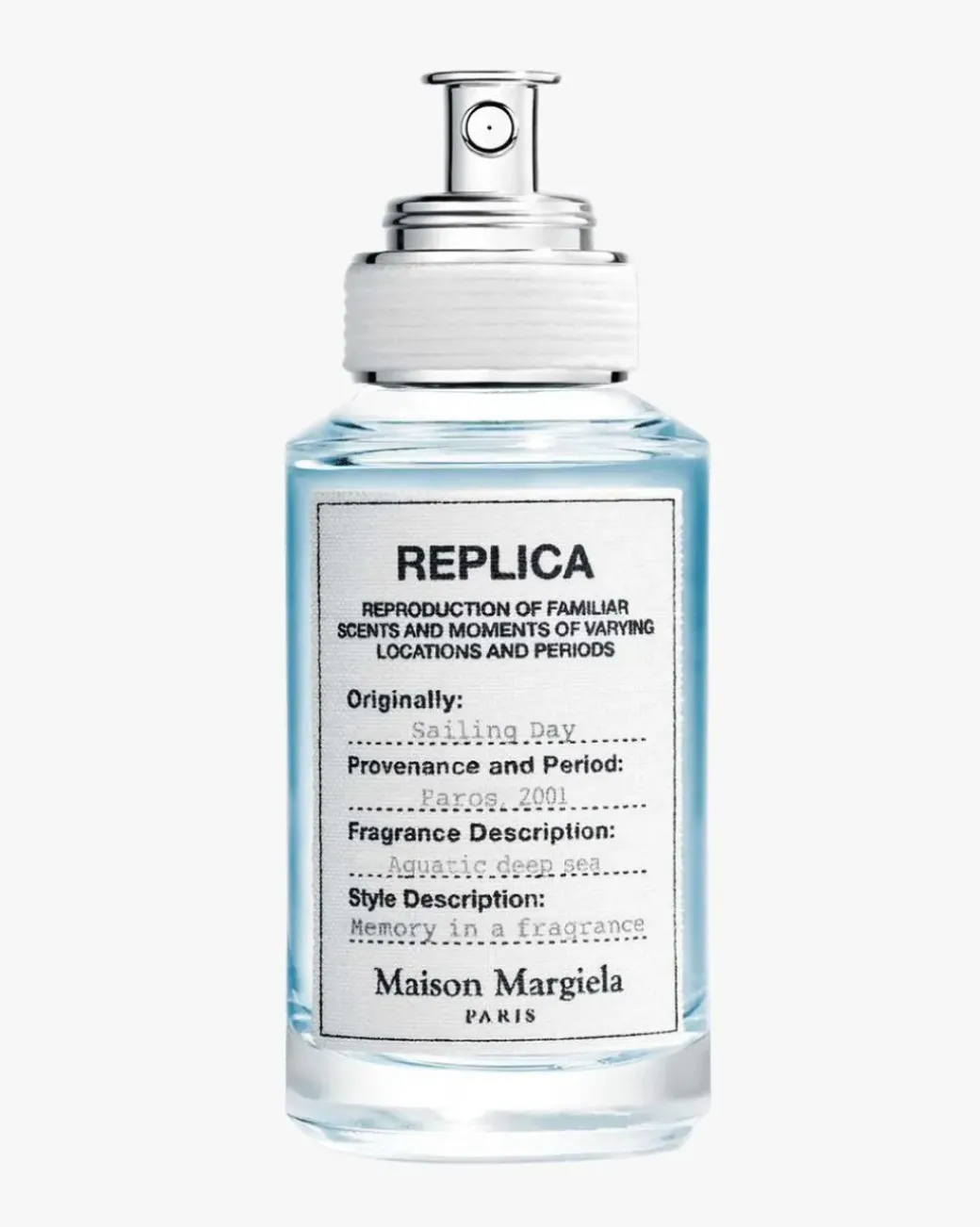 Fra minner til dufter: Replica-kolleksjonen samler ikoniske dufter og duftlys som har den universelle kraften til å trigge personlige øyeblikk, personlige historier som lever eller skal leves. Maison Margiela er tro mot sin «creative collective»-tilnærming, og samarbeider med de beste parfymørene. De er utvalgt for sin evne til å knytte minner til dufter, og stimulert av den kunstneriske fremførelsen av å komponere en duft som en universell invitasjon til å våkne, feire og dele uforglemmelige følelser. I tråd med Maisons’ minimalistiske tilnærming er Replica-flasken enkel, men sofistikert. Hver duft identifiseres av en bomullsetikett som ligner etikettene som brukes på klær og tilbehør i Replica-kolleksjonen.