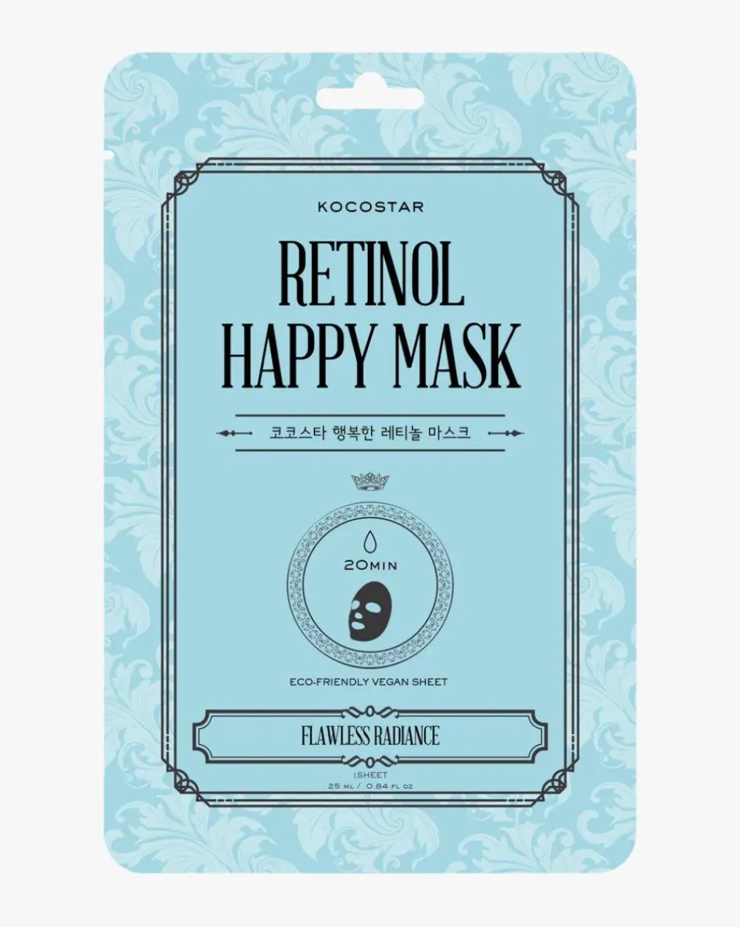 Kocostar Retinol Happy Mask inneholder retinol, en kraftfull derivat av vitamin A, kjent for sine anti-aldringsegenskaper og evnen til å forbedre hudens klarhet. Retinol stimulerer kollagenproduksjonen og fremmer hudfornyelse, noe som kan bidra til å redusere synligheten av fine linjer og rynker, samtidig som det gir en fastere hud. I tillegg hjelper retinol til med å kontrollere akne ved å redusere talgproduksjonen, jevne ut hudteksturen, og dempe arr og hyperpigmentering. Ansiktsmasken er også beriket med niacinamid for å jevne ut hudtonen, samt planteekstrakter av kollagen for å forbedre hudens elastisitet og fuktighetsnivå. Denne kombinasjonen av aktive ingredienser etterlater huden strålende og frisk, og føles myk. Masken er laget av en miljøvennlig 100 % plantebasert fiber, som sikrer tett tilpasning til huden og effektiv absorpsjon av essensen.