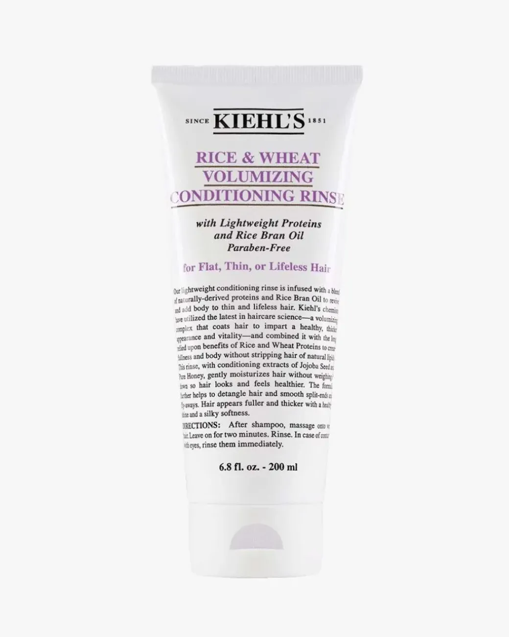 Kiehl’s Rice & Wheat Volumizer Conditioner er en balsam for fint og livløst hår som gir volum og vitalitet uten å tørke ut håret. Hjelper også å roe ned «brusete» hår og samle splittede spisser. Inneholder blant annet naturlige proteiner, poly-sukker, ris, hvete proteiner, honning og jojobafrø som pleier og gir næring til hår og hodebunn.
