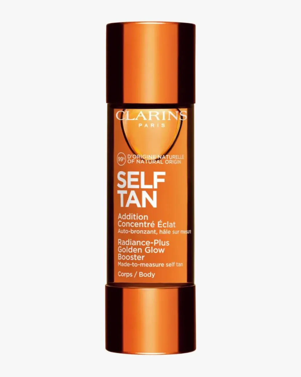 Clarins Radiance-Plus Golden Glow Booster Body blandes i hånden med din favoritt kroppskrem eller body lotion for å forskjønne huden med en skreddersydd, naturlig, strålende brunfarge. For en solbrun kropp igjennom hele året!