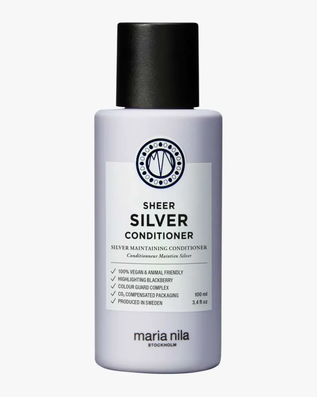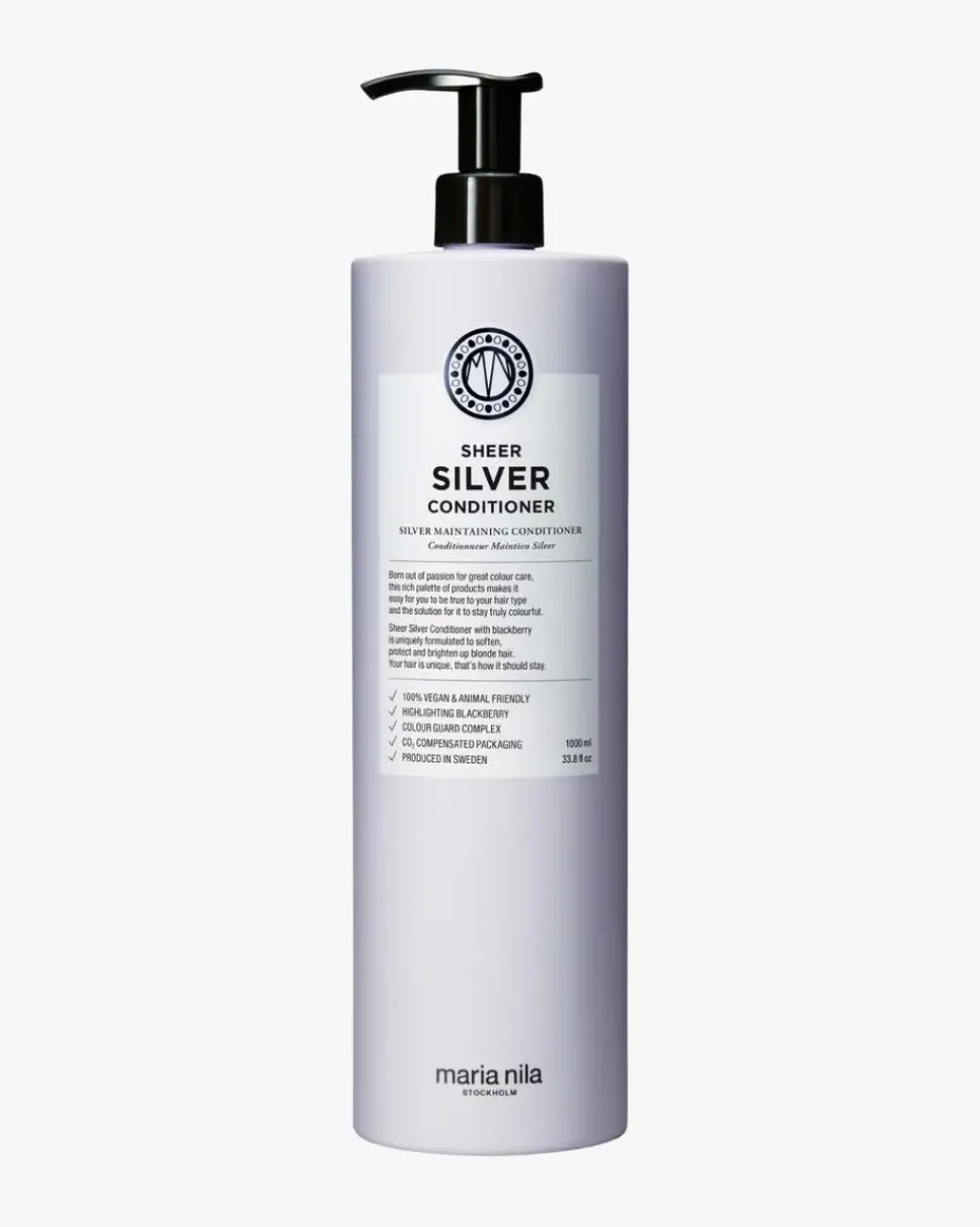 Maria Nila Sheer Silver Conditioner er en flokeløsende balsam for naturlig og farget blondt, hvitt og grått hår som mykgjør, fukter og styrker håret ditt. Violett pigment og bjørnebærekstrakt nøytraliserer gylne nyanser og gir glans som forsterker og lysner opp kjedelig farge. Sheer Silver Conditioner har en fruktig og blomsterduft av jasmine, appelsin og grapefrukt. Colour Guard Complex bevarer fargen ved å beskytte håret ditt mot UV-stråling og frie radikaler.