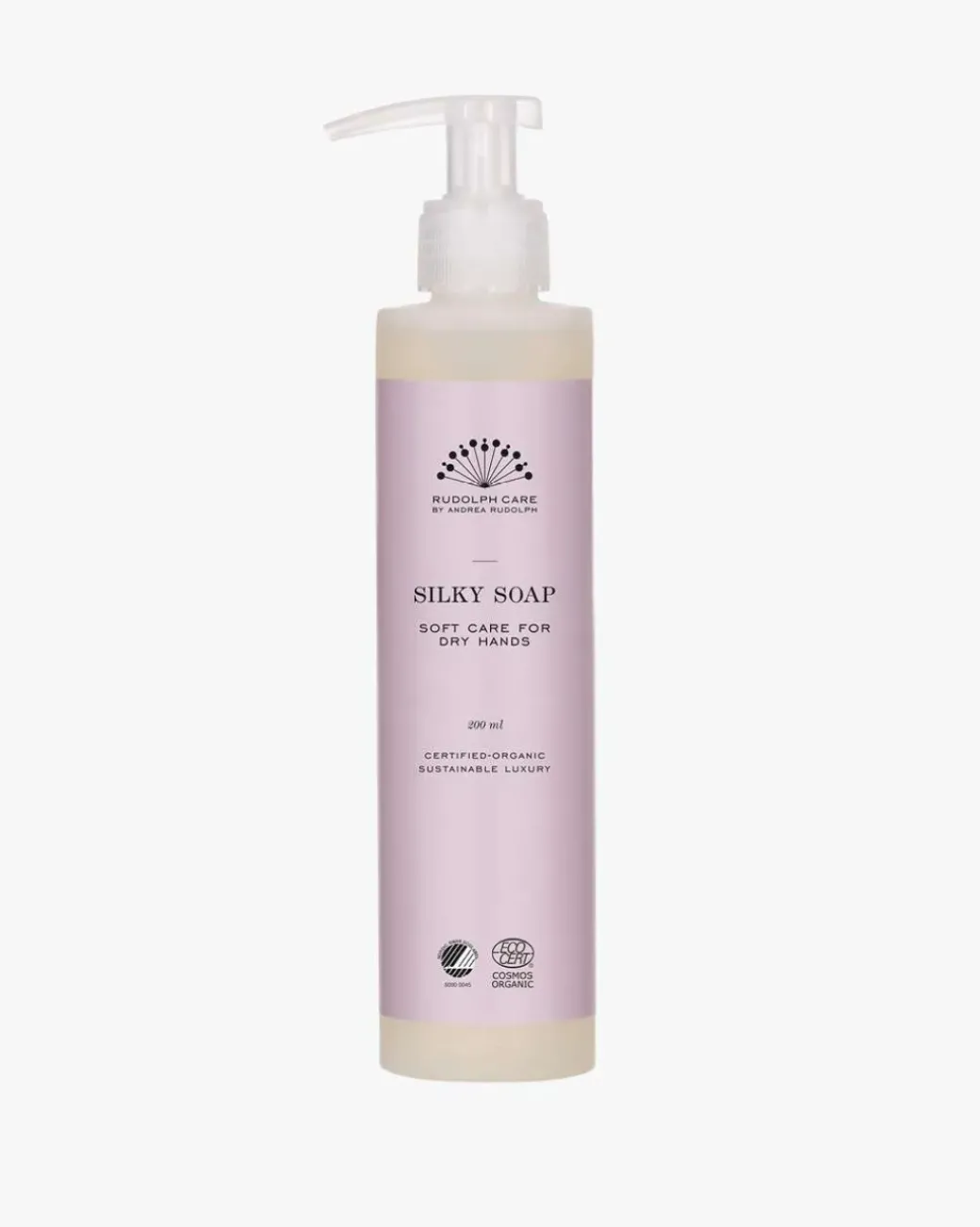 Rudolph Care Silky Soap er en eksklusiv såpe til hender og kropp. Pumpen gjør den praktisk å ha stående ved vasken, og ett pump av såpen er nok til én håndvask. PH-verdien ligger nært hudens egen, slik at såpen rengjør uten å tørke ut. Dessuten har den fuktighetsbevarende ingredienser, slik at huden blir både ren og myk.