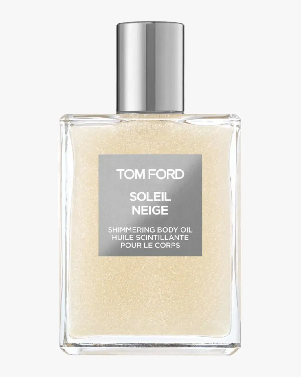 TOM FORD Beauty Soleil Neige Shimmering Body Oil. Silkemyk. Lett. Opplysende. TOM FORD Soleil Neige Shimmering Body Oil fanger den trykkende effekten av lysreflekterende, strålende hud og frister sansene med sitrus og blomstrende musk fra Private Blend Soleil Neige. Denne silkemyke, lette oljen lyser opp huden med platinafarget skimmer. Duften leder tankene mot det fredelige skinnet fra solen på snø.