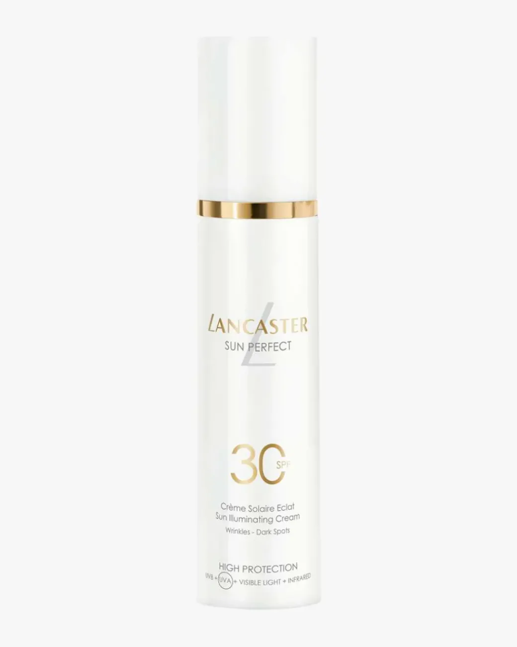 Sun Perfect er Lancasters mest avanserte solserie, som kombinerer hudpleie mot aldringstegn med solbeskyttelse og kan brukes året rundt. Sun Perfect Sun Illuminating Cream SPF 30 er basert på Lancasters eksklusive og avanserte Full Light-teknologi, som beskytter mot 100 prosent av solstrålingen*, samt Lancasters egen anti-aging-teknologi, det naturlige Sun Repair-systemet og Glow Booster-komplekset. Sammen gir de huden en bredspektret beskyttelse mot UVB- og UVA-stråling, synlig lys og infrarødt lys, som bidrar til å beskytte huden mot solskader og styrker hudens barriere. Produktet forebygger og korrigerer også rynker, fine linjer og pigmentflekker. I tillegg forbedres hudens fuktighetsinnhold og struktur, noe som fremhever hudens naturlige glød. Huden ser jevnere og mer ungdommelig ut, med en naturlig glød året rundt. Dette oppgraderte produktet er både rent og havvennlig, virker beroligende på huden og tilfører fuktighet som varer lenge. Denne solkremen fra Lancaster har en lett og ultrabehagelig konsistens som gjør den lett å påføre. Det smelter umiddelbart inn i huden og føles ikke klisset eller fett. Denne behagelige solkremen til ansiktet er helt usynlig etter at du har smurt den på. Den gir en flott glød og en silkemyk finish.