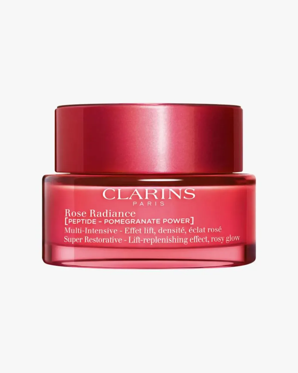Clarins Super Restorative Rose Radiance Cream. For denne generasjonen av Rose Radiance Cream retter Clarins Research seg mot tap av rosenrød glød i menopausal hud.