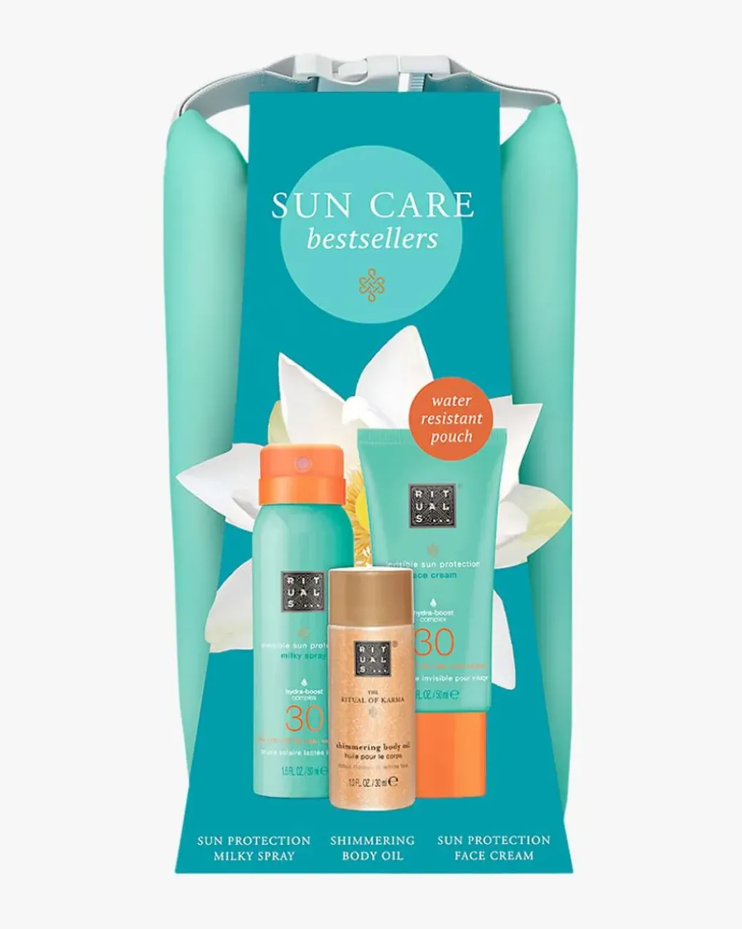 Settet inneholder: The Ritual of Karma Shimmering Body Oil 30ml, Invisible Sun Protection Face Cream SPF30 50ml og Invisible Sun Protection Milky Spray SPF30 50ml.