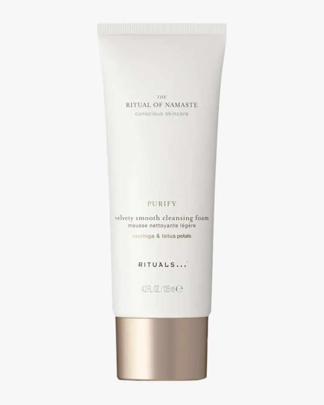 Rituals The Ritual of Namaste Velvety Smooth Cleansing Foam. Din sjelfulle hudpleierutine starter med denne myke, milde og såpefrie rensekremen. Denne eksklusive rensen inneholder kronblader fra lotus – et indisk symbol på renhet, skjønnhet og visdom som er kjent for sine fuktighetsgivende egenskaper – og fjerner både urenheter og bekjemper daglig forurensning. Frisker opp, tilfører fuktighet og gjør huden klar for resten av hudpleierutinen.