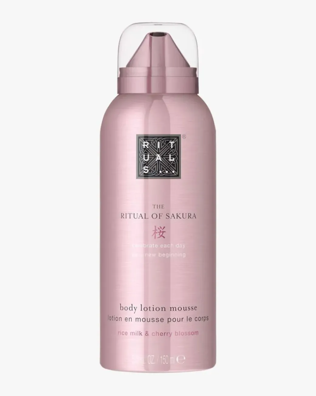 Rituals The Ritual of Sakura Body Lotion Mousse. Denne kroppskrem-moussen tilfører huden fuktighet for en silkemyk, velduftende følelse. Den er beriket med rismelk og kirsebærblomst, kjent for å være beroligende og fuktighetsgivende, og etterlater huden myk og med en strålende glød. Den blomsteraktige duften åpner opp med myke, melkeaktige undernoter som etterfølges av friske, sitrusaktige grønne noter. Duften går deretter over til en harmonisk blanding av søte kirsebær og fortryllende, florale hint.