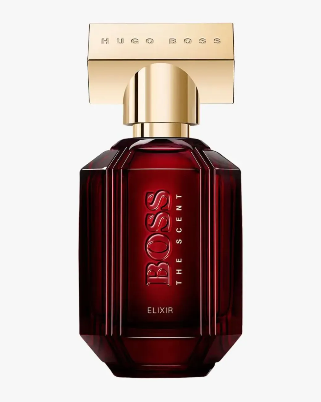 Den ikoniske Boss The Scent-flasken er kledd i det samme dyprøde lakkerte glasset som sitt maskuline motstykke, og reflekterer den forførende intensiteten til den hypnotiske duften inni flasken.