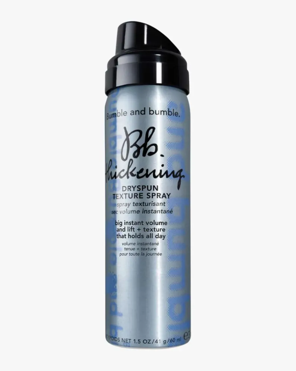 Bumble and bumble Thickening Dryspun Texture Spray er en gjennomsiktig, tørr finish-spray som gir øyeblikkelig +40% mer volum (som varer hele dagen), sammenlignet med ubehandlet hår, i tillegg til en løft og en luftig tekstur.