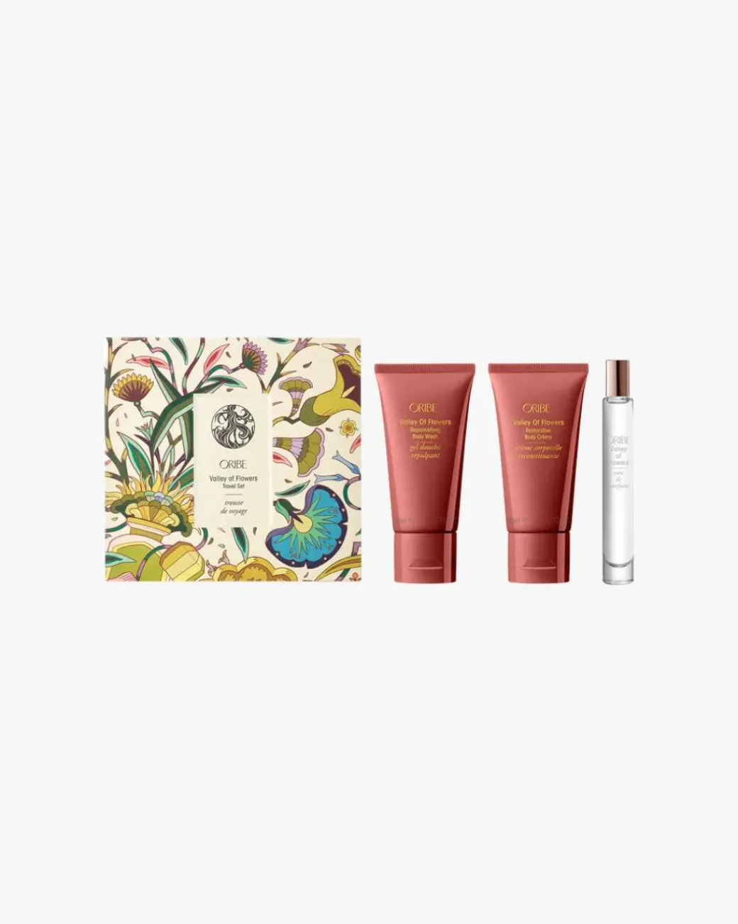 Oribe Valley of Flowers Travel Set. Det er som å vandre inn i en levende blomstereng i full blomst. Valley of Flowers Eau de Parfum, Replenishing Body Wash og Restorative Body Crème kombinerer noter av bulgarsk rose, pionblomster, varm rav og strukturert skog for en virkelig velduftende opplevelse.