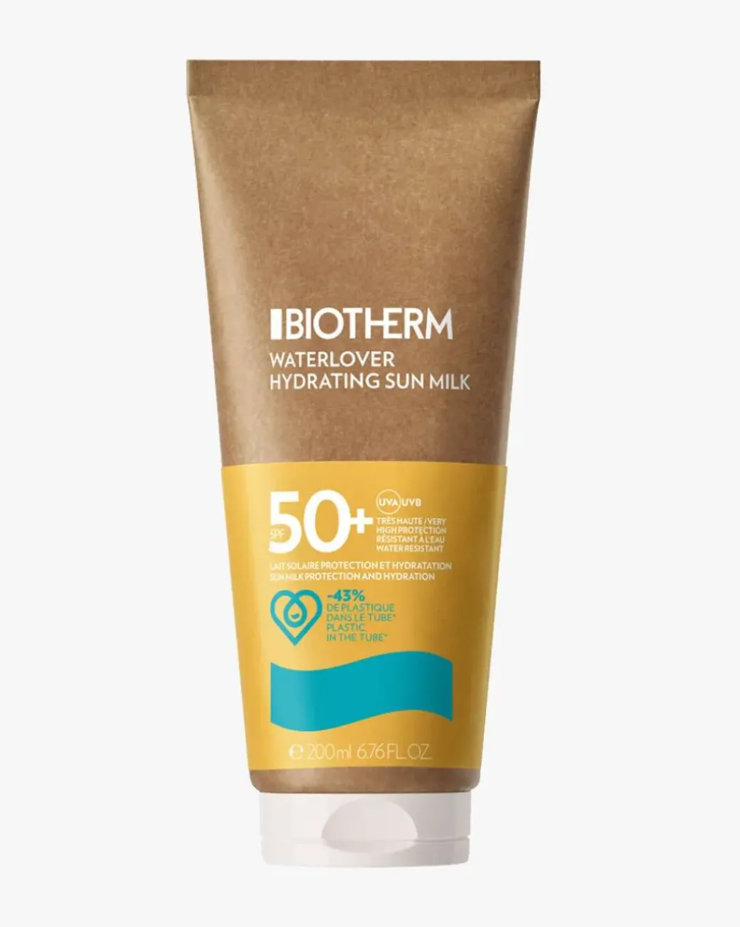 Biotherm Waterlover Hydrating Sunmilk SPF50 er en solkrem i en bærekraftig papirbasert tube. Kan brukes til både kropp og ansikt. Solkremen er til hele familien uansett hudtype. Beskytter effektivt mot solen (UVA & UVB), og fukter huden samtidig. Kremen trekker seg raskt inn i huden uten å etterlate hvite merker. Inneholder duftnoter av sitrusekstrakter.